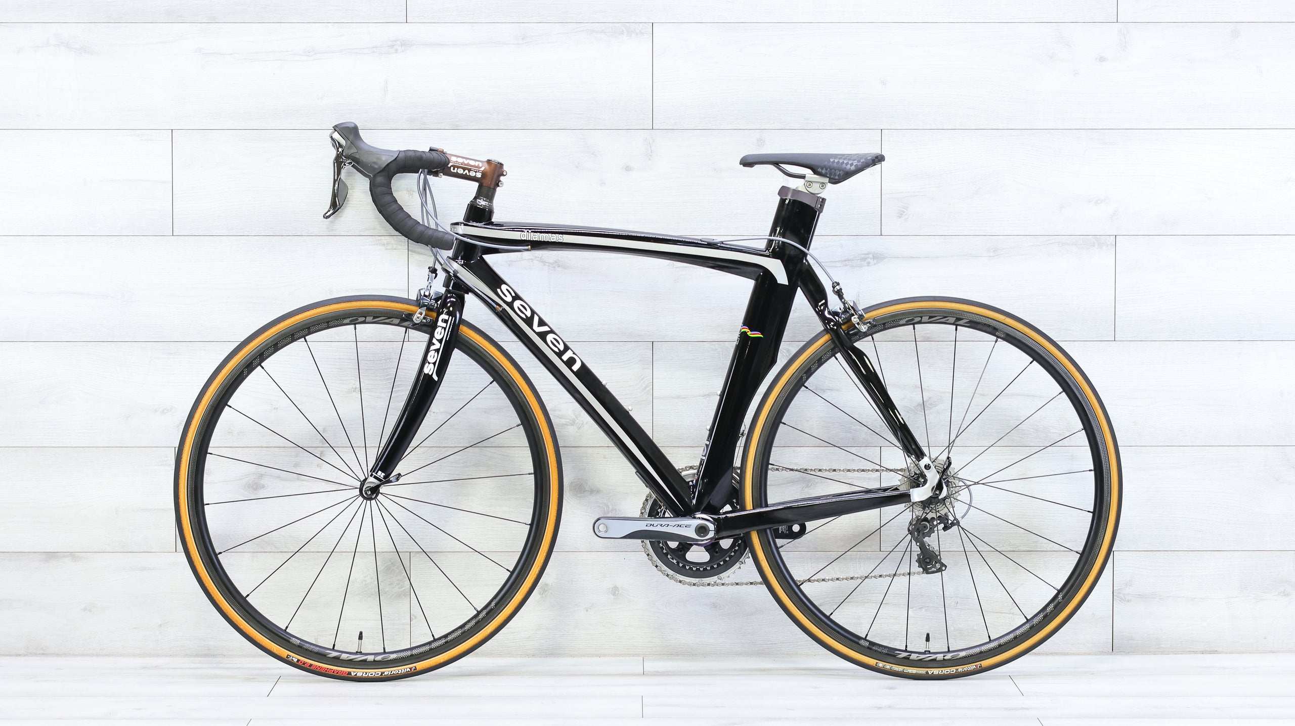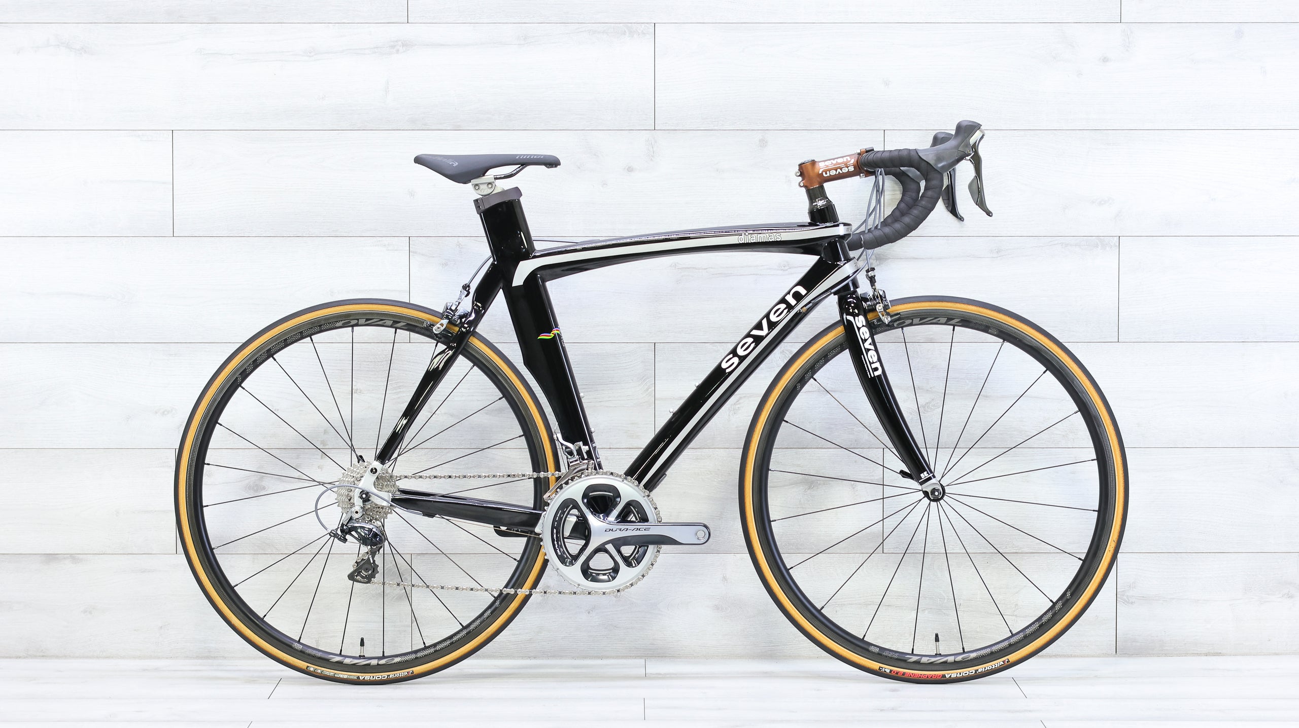 The Seven Cycles Diamas is a handcrafted titanium/carbon fiber road bike that blends timeless craftsmanship with modern performance. Its custom-built carbon frame delivers a smooth, lively ride with excellent power transfer and vibration dampening. Outfitted with a Shimano Dura-Ace drivetrain for crisp, reliable shifting, Oval 928 carbon wheels for added efficiency and speed, and a Zipp Contour SL SS carbon handlebar for precise control and comfort, this Diamas reflects Seven’s reputation for precision and ride quality. Built for riders who appreciate custom craftsmanship and refined road manners, it’s a premium road bike designed to be ridden hard and enjoyed for years.