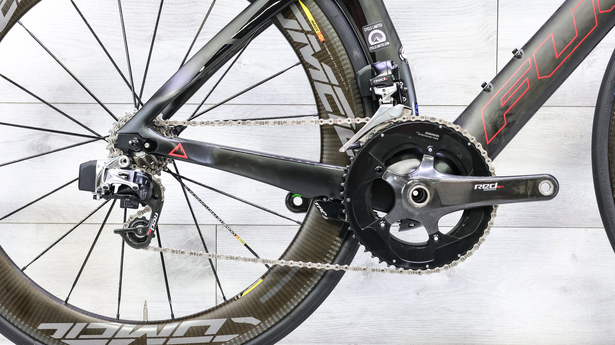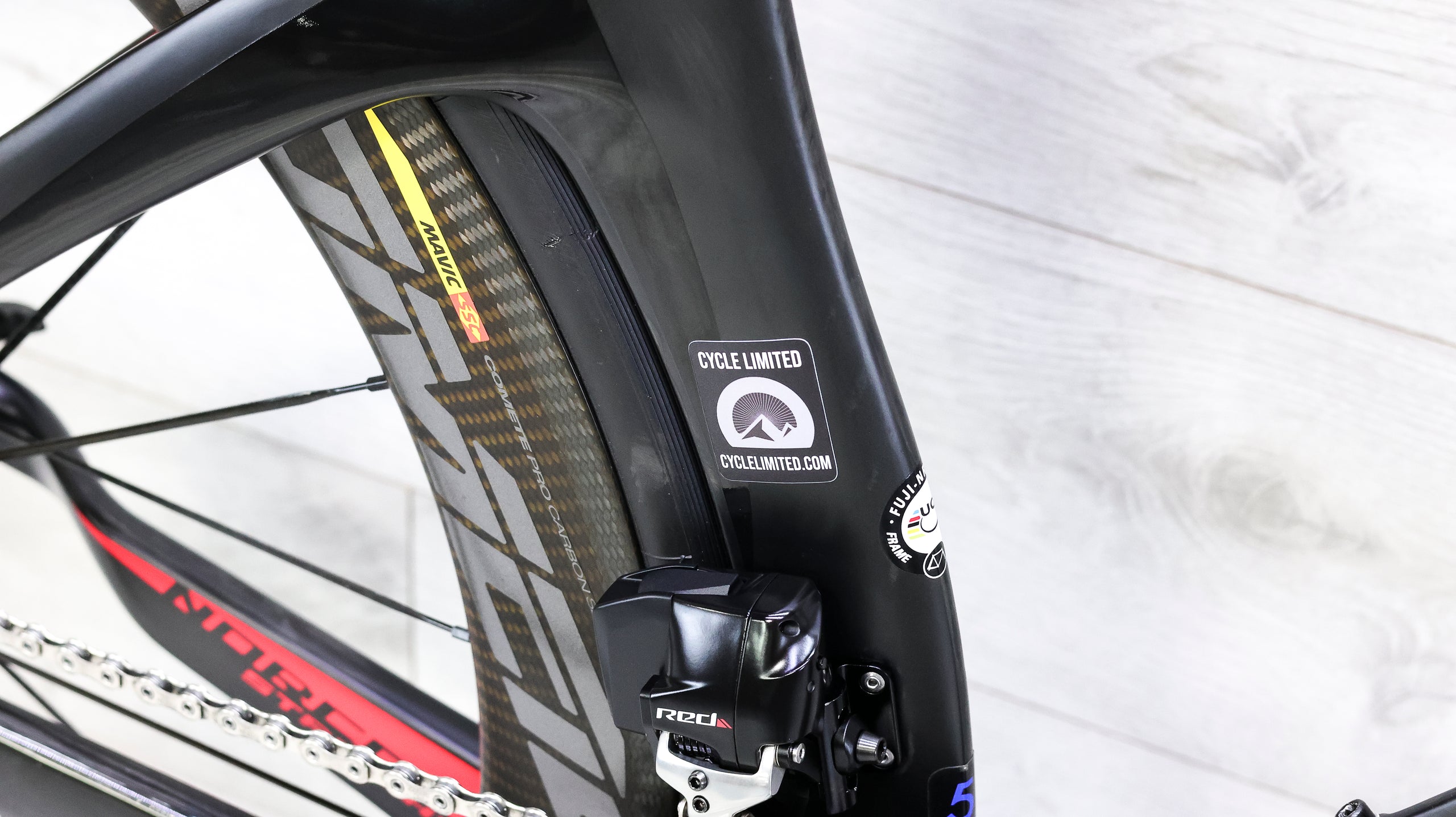 The Fuji Norcom Straight 1.1, dressed up with Mavic Comete Pro Carbon SL wheels and a full Profile Design carbon cockpit, is built for athletes who want a clean line from power to speed. The Norcom’s aero frame shapes already cut through wind with purpose, but the deep-section Mavics add that steady, momentum-rich feel that helps hold pace on long flats and rolling terrain. The upgraded basebar and extensions give the front end a more refined, dialed-in fit and a stiffer, more confident platform for sustained efforts. The whole package feels sharp, fast, and intentional—ready for triathletes or time trialists who value efficiency and a setup that encourages you to stay tucked and keep pushing.