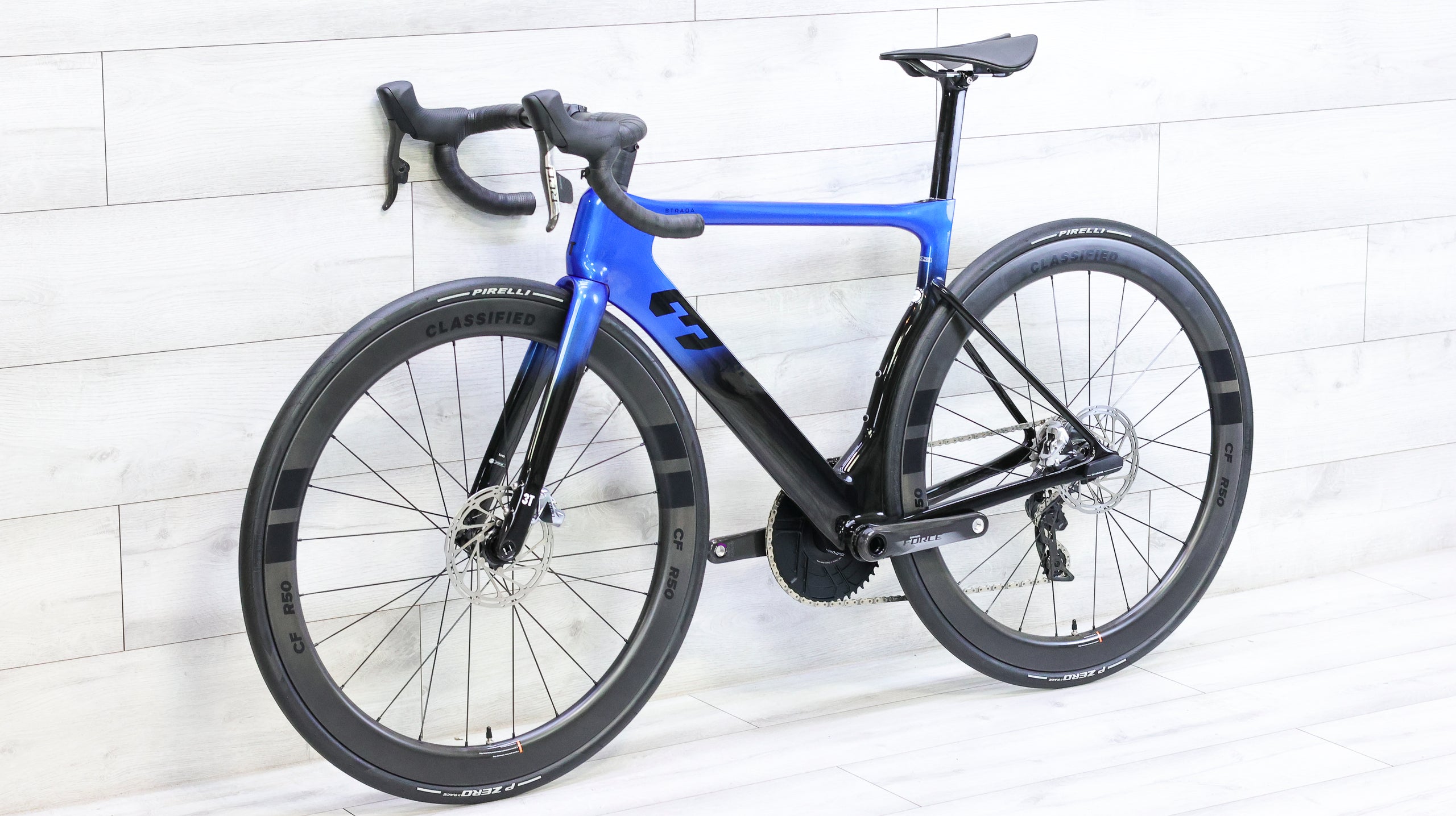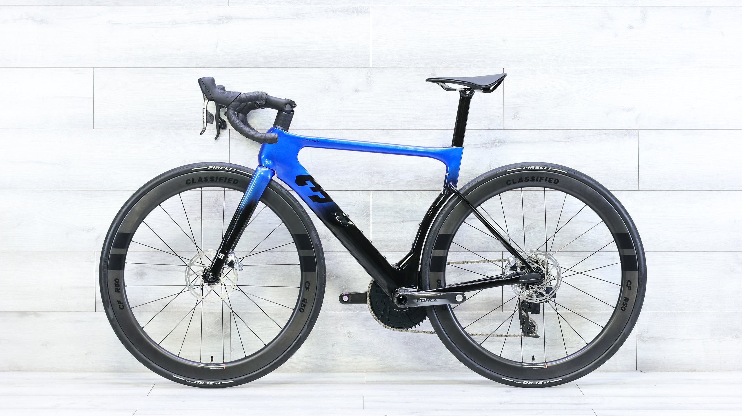 The 3T Strada Red AXS 1x12 Classified R50 is a cutting-edge aero road bike that blends race-focused efficiency with next-generation drivetrain technology. Its high-modulus carbon frame is optimized for aerodynamics and comfort, using 3T’s signature wide-tire aero design to maintain speed while enhancing ride quality. Equipped with SRAM’s wireless Red AXS 1x12 groupset and the innovative Classified R50 rear hub, it delivers the simplicity of a 1x setup with the range and efficiency of a 2x system—all without front shifting. Deep carbon wheels, integrated cockpit routing, and precision disc braking complete a build that’s as fast as it is refined. Lightweight, sleek, and uncompromising, the Strada Red AXS Classified is built for riders who demand pure performance and cutting-edge innovation.