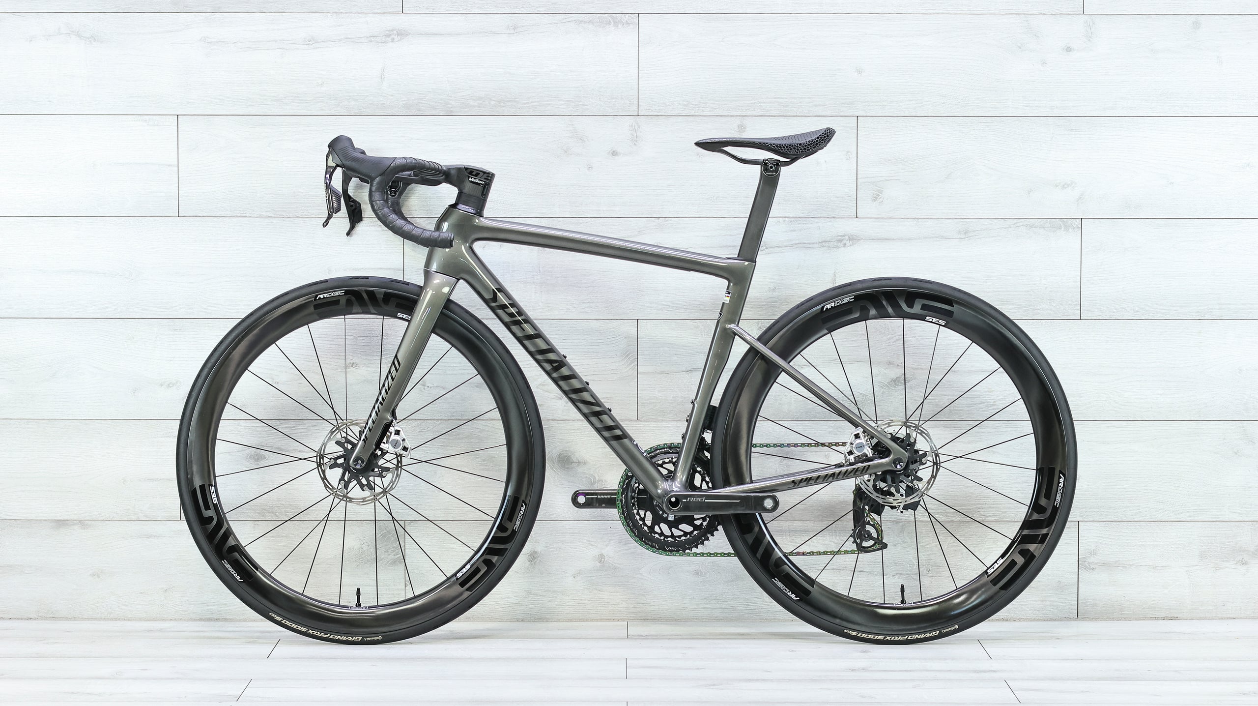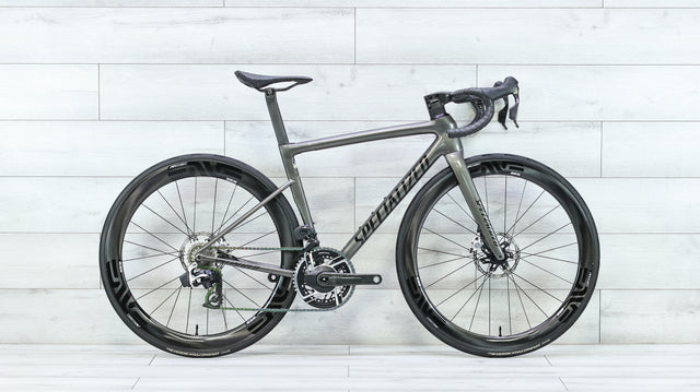 The Specialized Tarmac SL8 is a next-generation race bike that blends low weight, aerodynamic efficiency, and sharp handling into a platform built for speed across varied terrain. Its carbon frame delivers exceptional stiffness and responsive power transfer, while the geometry keeps the bike stable at pace and precise through corners and descents. This build is elevated with a wireless SRAM Red AXS drivetrain with an integrated power meter for accurate shifting and performance tracking, paired with a Vision Metron 5D ACR carbon barstem for a clean, aerodynamic cockpit. A ENVE SES 4.5 AR Disc carbon wheelset adds speed and versatility, while the Specialized S-Works Romin Evo Mirror saddle rounds out the build with a high-end, comfort-focused touchpoint—resulting in a refined, race-ready setup built for riders who want a fast, integrated road bike that performs at the highest level.